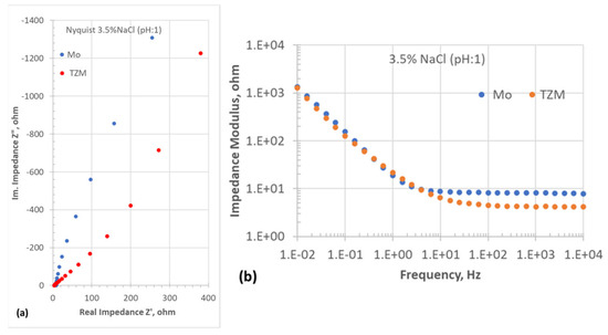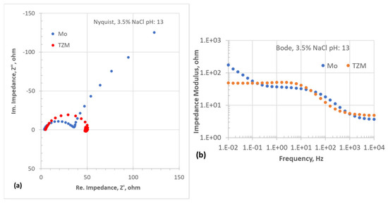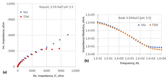 Electrochemical impedance spectroscopy plots of Mo and TZM samples in neutral 3.5% NaCl solution (pH: 13): (a) Nyquist plots and (b) Bode plots.
