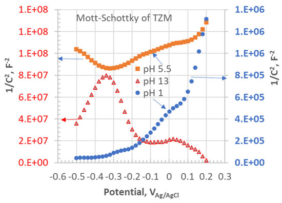 The Mott–Schottky results for TZM are presented in Figure 8. The Mo samples also exhibited similar trends under each pH condition. Charge carrier densities of the surface layer were calculated from the slopes of the Mott–Schottky (M-S) plots and summarized in Table 4. The positive slope of the M-S plots indicated n-type semiconductivity, implying that oxygen vacancies were the majority charge carriers. Here, cation interstitials were ignored because Mo cations would be too large to be accommodated as a defect in the lattice. The negative slope in the M-S plot indicated p-type semiconductivity, implying that cation vacancies were the major charge carriers. Since both n-type and p-type behaviors were observed in neutral and alkaline conditions, it was presumed that a dual-layered surface film formed on the samples. The charge carrier density of the film formed on the Mo sample was lower than that of TZM in all the pH conditions, which aligned with the EIS and CP results. In most cases, the charge carrier density of the p-type film was lower than that of the n-type film. The n-type charge carrier density was in the order of 1019 cm−3 (with one exception), indicating that the film could be described as MoO3-x, with x~0.001–0.001. For the p-type layer, the film could be described as Mo1-xO3, where x~0.0001–0.001.