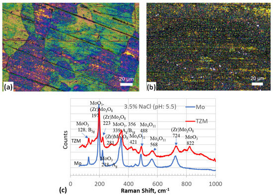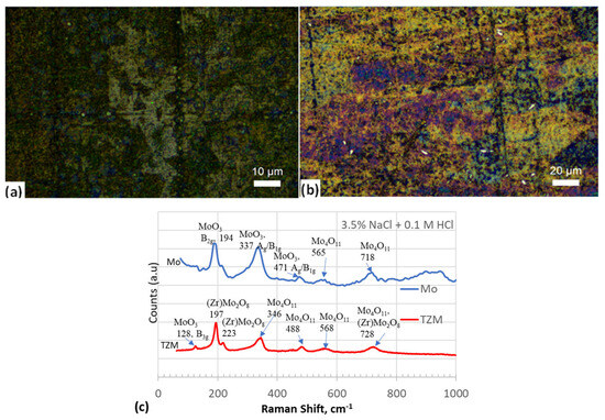 Figure 11a,b show the surfaces of Mo and TZM after testing in the alkaline chloride solution. The CP results did not show any growth of a passive layer. However, the polished surface was covered by a film due to the accumulation of corrosion products. The pit-like features were not deep and could be removed by polishing with 1200 grit emery paper. Since no passivation was observed, these pits were not due to the breakdown of the passive film but rather caused by localized attack at the microstructural heterogeneities. Figure 11c shows the Raman spectra of the samples after corrosion testing in the alkaline chloride solution. In this case also, a MoO3-type layer was observed. Additional peaks were associated with the oxychloride compounds of molybdenum. The broadened and weak peaks indicated that the film formed on the TZM was highly defective and thin.