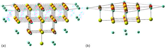 First-principles calculations were conducted within the framework of the generalized gradient DFT formalism, employing the exchange-correlation functional proposed by Perdew, Burke, and Ernzerhof (PBE) []. This functional was combined with its respective Grimme’s D3 semi-empirical correction for long-range dispersion effects [] with rational damping according to Becke and Johnson (BJ) []. It should be underlined that the performance of a specific density functional in producing reliable results generally depends on the chemical system under study. Thus, the selection of a specific density functional should be always made with great caution. The dispersion-corrected PBE-D functional was adopted here to calculate exchange-correlation energy because there is some rationale behind the choice of this functional. PBE-D was successful in predicting various properties of MgO [,]. Moreover, this functional was previously used to investigate the adsorption of metallic clusters on MgO(100) [,], as well as Sn clusters on different supports [,].
