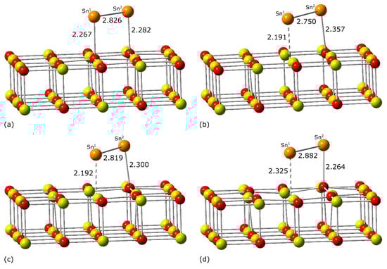It is instructive to compare the Eads energy of Sn2 on the MgO(100) surfaces to the corresponding energetic effects for the dimers of other metals. The most stable adsorption configuration of Sn2 at the O5c center is associated with much more favorable Eads energy (−2.86 eV) than the adsorption of such noble metal dimers as Pd2 (−1.66 eV []) or Au2 (−1.49 eV []) on the regular MgO(100) surface. Similarly, the most stable adsorption configurations of Sn2 at the and centers produce a slightly greater gain in Eads than Au2 adsorption at these defects on MgO(100) [].