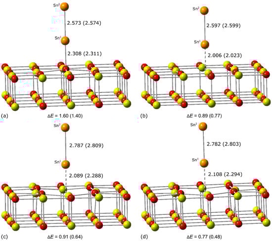 The former signifies the dimerization energy of a free Sn atom (that is, a gas-phase one) to another Sn atom already bound at a given adsorption center (Sn/MgO), while the latter roughly estimates the dimerization energy between two already adsorbed Sn atoms, one of which has been always bound at the O5c center [(Sn/MgO)regular]. To obtain these dimerization energies, the adsorption of a single Sn atom on the regular and defective MgO(100) surfaces was studied using PBE-D in combination with Model 1 and Model 2. According to the convention adopted in Equations (3) and (4), the more and more negative values of and signal the growing tendency of single Sn atoms to dimerize.