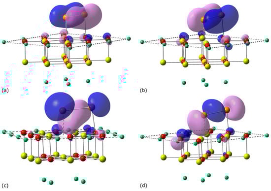 It is interesting to examine how the defective centers affect the highest occupied molecular orbital (HOMO) for the adsorbed dimer. The HOMO is essential for describing the reactivity of chemical systems [], including metal atoms and clusters adsorbed on MgO(100) [,,]. The contours of the HOMO for the lowest-energy structures of Sn2 adsorbed on the regular and defective MgO(100) surfaces are plotted in Figure 4. While the shapes of the HOMO for Sn2 at the O5c and centers look almost identical, the presence of charged oxygen vacancies noticeably influences the shape of the HOMO for the dimer adsorbed at the or center. The orbital composition analysis of the HOMOs in Figure 4 reveals that these orbitals contain leading contributions from atomic orbitals of both Sn atoms, regardless of the surface center adsorbing the dimer. The contributions from the Sn atoms add up to at least 64% and this percentage total reaches a maximum of 74% at the upper end of the following sequence Sn2/ < Sn2/ < Sn2/ < Sn2/O5c. The Sn atoms of the dimer adsorbed at O5c, or provide almost exclusively their p-type atomic orbitals to form the HOMO whereas the HOMO of Sn2/ also exhibits minor contributions from the s- and d-type orbitals of the Sn atoms (these contributions amount to 8% in total).