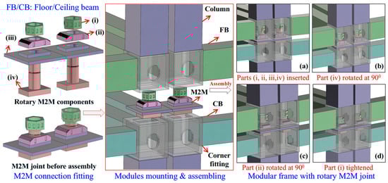 Assembly of modular frames with rotary M2M connections [i, Nut; ii, Rotary part; iii, Connecting plate; and iv, Bolt]. Note: (a) Parts i, ii, iii, and iv of the M2M connection are inserted into the corner fittings of the upper, lower, right, and left modules, respectively; (b) Part iv is rotated by 90°; (c) Part ii is rotated by 90°; (d) Part i is finally tightened to complete the assembly.