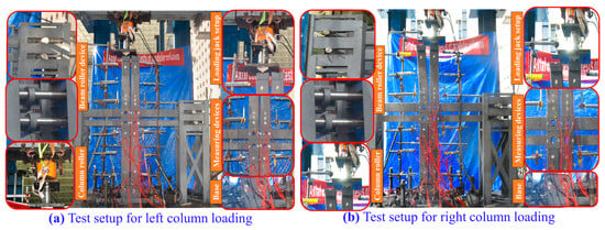 The progressive compressive loading setup for modular steel frames, shown in Figure 3a,b, was designed to apply sequential column loading. First, the left column was loaded until failure, after which the loading system was shifted to the right column to examine load redistribution, P-Δ effects, and progressive failure behavior. During testing, the adjacent upper column remained free (linked via an M2M connection) to simulate realistic load transfer mechanisms in modular frames. A compressive load was applied to the UC using a hydraulic jack connected to the roller supports above to ensure consistent vertical loading throughout specimen deformation. A load sensor, secured between the jack and base plate, recorded reaction forces. A single-column knife-edge support, fixed to the base plate, permitted in-plane but constrained out-plane displacement/rotation, thereby enabling precise load transmission. LCs were pin-supported at the base, allowing in-plane rotation while preventing translation. To control beam movements, beam roller supports were installed on both left and right modules, restricting vertical displacement while permitting in-plane translation and rotation. This configuration aligns with recommended sway-frame testing methods [63]. Following GB/T50344-2019 [84], the loading protocol incorporates preloading (20% of ultimate capacity for two minutes, followed by unloading) and formal hybrid force–displacement control loading. Force-controlled (and displacement-controlled) formal loading was applied until yielding (after yielding until the applied load dropped to 85% of ultimate capacity) at a 0.05 mm/min rate. Reaction forces were recorded via the load sensor, while end-shortening measurements were taken using a vertical LVDT (V3), as shown in Figure 2a. Figure 2b illustrates that 61 strain gauges were installed to track buckling, yielding, and force transfer mechanisms. Because local buckling (LB) was expected near M2M connections on UCs, gauges were concentrated at column ends, midpoints, and highly stressed regions. Due to space constraints, no strain gauges were placed between beam and column gaps. Thirteen (or twelve) horizontal LVDTs (H1-H14) were positioned on UCs/LCs/FBs/CBs during left (or right) column loading to monitor lateral deflection and buckling, while four additional LVDTs (V1–V4) were placed near M2M zones for joint rotation and beam deflections. Data were continuously recorded using a high-precision acquisition system to ensure accurate tracking of progressive failure mechanisms.