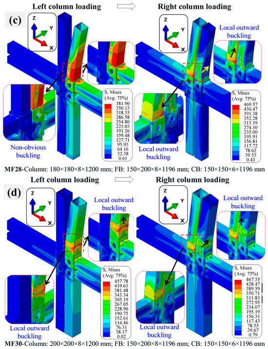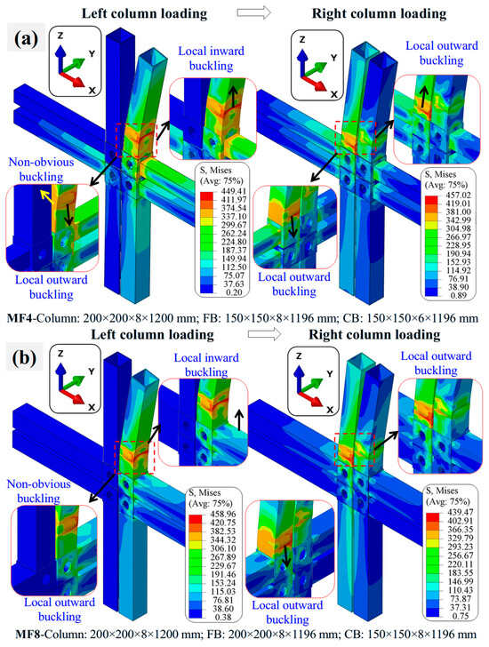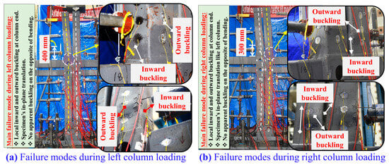 Figure 4a,b illustrates that the modular steel frame exhibited in-plane translation in the direction of column bending. During left-column loading, the entire frame translated left, and when the right column was loaded, the exact directional translation was observed, indicating that failure progression followed the initial failure pattern. The extent of translation was influenced by the rigidity contrast between beams and columns, with more flexible beams exacerbating lateral instability. As system translation increased, gaps formed at the M2M connections between the upper and lower frame skeletons, shifting force transfer through the connecting plate. This confirms the semi-rigid behavior of the M2M connections, reinforcing their role in load redistribution. Upon reaching compressive capacity, the left column exhibited local buckling at the upper column root, approximately 400 mm from the joint. This buckling was characterized by inward and outward deformations along the bending face and adjacent sides, while the opposite face remained largely unaffected. Similarly, the right column, upon loading, exhibited local buckling at a lower height of approximately 300 mm, maintaining the same bending direction as the left column. The adjacent inner faces of the columns did not collide, as the left column remained free of inward buckling while the right column developed localized inward deformations. However, as buckling intensified, the right column was at risk of colliding with the left column, potentially compromising frame stability and necessitating a halt in loading for safety considerations. Strain measurements revealed that local buckling initiated elastically (before yielding) along regions aligned with or opposite to bending, while plastic buckling (post-yielding) occurred in adjacent column faces. The FBs/CBs, LCs, and M2M connections did not buckle or yield, which demonstrates their role in efficient load transfer and preventing premature failure. However, several locations on the UCs experienced yielding, as they were the primary load-bearing members. Despite variations in local buckling locations between the left and right columns, the modular frame remained structurally stable, as the M2M connections effectively redistributed forces to adjacent members without localized failure. These results highlight the safety and integrity of modular frames with rotary M2M connections under progressive compressive loading, which ensure continued structural performance despite sequential column failures.