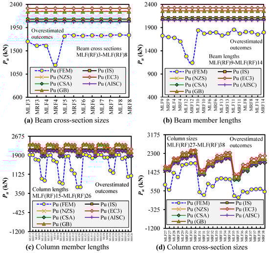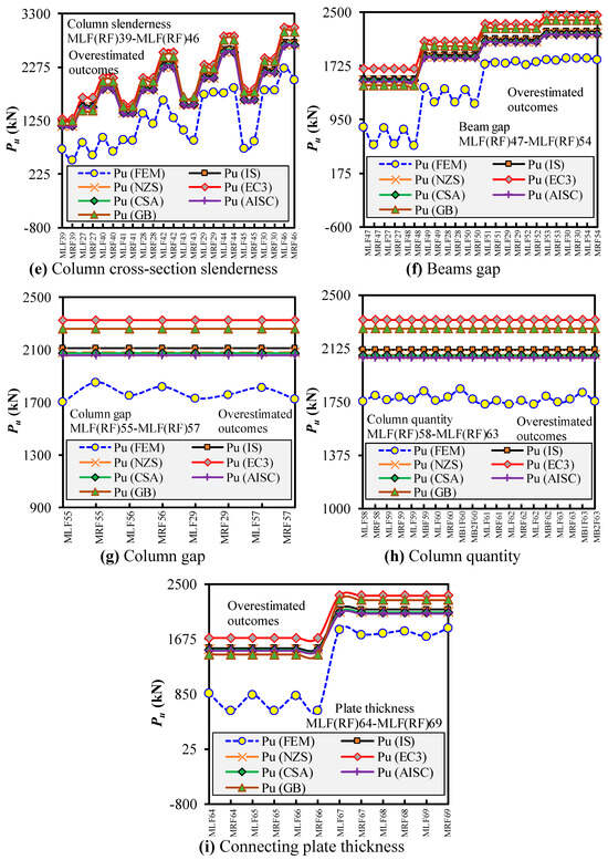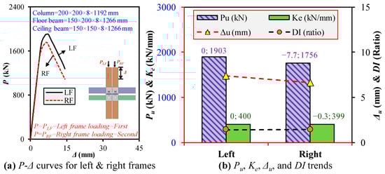 The progressive compressive response of modular steel interior frames was evaluated under varying floor and ceiling beam lengths (L)FB/CB while keeping all other structural parameters consistent with the validated FEM configuration, as shown in Figure 16a,b. When analyzing frames with identical cross sections but varying beam lengths (e.g., 150 × 150 × 8 mm in MLF/RF-9, 4, 12) from 600 mm to 3000 mm, Pu decreased by 25.7% (from 1725.36 to 1282.97 kN), Ke dropped by 49.4%, Δu reduced by 13%, and the DI rose to 70% for left-frame column loading (MLF), which indicates instability-driven failure but a more extended post-buckling phase. For the right frame (MRF), the reduction in Pu was even more critical—32.6%—along with a 33% drop in Ke and a dramatic increase in Δu to 7.38 mm (75%), which implies accumulated sway and delayed failure due to prior left-side loading. Similarly, for the 150 × 200 mm beam group (MLF/RF-10, 6, 13), Pu peaked at 1841.27/1771.62 kN (600 mm), stayed steady at 1790.06/1798.03 kN (1196 mm), and then dropped to 1729.56/1771.25 kN (3000 mm). The stiffness followed a similar declining pattern. However, right-frame loading showed a dip in DI in the 3000 mm cases (e.g., MRF13: 0.85), which suggests asymmetric post-buckling behavior under progressive failure. Similarly, for 200 × 200 mm beams (MLF/RF-11, 8, 14), longer spans slightly reduced Pu and Ke but retained more consistent ductility. However, the right frame again showed greater sensitivity, where DI fell from 1.48 (MRF11) to 0.86 (MRF14), thus reinforcing that instability effects from left-side loading dominate the right column’s failure path, especially in longer beam configurations. Increasing beam cross sections enhances strength and stiffness with minimal impact on ductility. By contrast, longer beam spans significantly reduce Pu and Ke while amplifying ductility inconsistencies, especially under right-column loading, due to accumulated deformation from progressive sequencing. This underscores the need to optimize beam size and span to balance load capacity and post-peak resilience, particularly in modular structures prone to sequential failure propagation.
