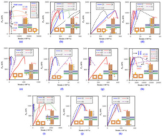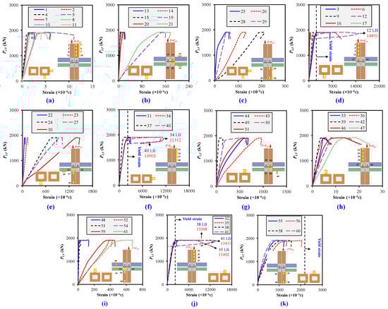 Load vs. strain curves of frames under right-column compression loading: (a) Strain curves at the upper right column, front direction; (b) Strain curves at the right beams and M2M connections, front direction; (c) Strain curves at the lower right columns, front direction; (d) Strain curves at the upper left columns and M2M connections, front direction; (e) Strain curves at the lower left columns and M2M connections, front direction; (f) Strain curves at the upper left column, side direction; (g) Strain curves at the back side of left M2M connections; (h) Strain curves at the back side of the upper right column and M2M connections; (i) Strain curves at the back side of the right beams, lower right columns, and M2M connections; (j) Strain curves at the back side of the left columns; (k) Strain curves at the back and side of the lower left column.