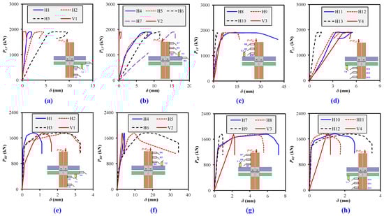 Load vs. deflection curves of the frame under left-/right-column compression: (a) Deflection curves at the lower right column and right ceiling beam under left column loading; (b) Deflection curves at the right floor beam and upper right column under left column loading; (c) Deflection curves at the upper left column and left floor beam under left column loading; (d) Deflection curves at the lower right column and right ceiling beams under left column loading; (e) Deflection curves at the lower right column and right ceiling beam under right column loading; (f) Deflection curves at the right floor beam and upper right column under right column loading; (g) Deflection curves at the upper left column and left floor beam under right column loading; (h) Deflection curves at the lower right column and right ceiling beams under right column loading.