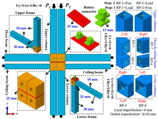 Experimentally validated FEM of the modular frame for progressive behavior. Note: White crosses at the cross-section centers represent the reference points named RP-1, RP-2, RP-3, RP-4, RP-5, RP-6, RP-7, and RP-8, corresponding to the upper left column, upper right column, lower left column, lower right column, right floor beam, right ceiling beam, left floor beam, and left ceiling beam, respectively.
