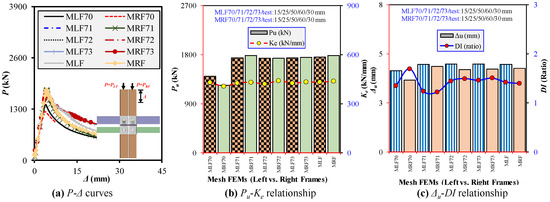 A mesh sensitivity analysis determined the optimal element size for accurately capturing progressive compressive failure in modular steel frames. The FEM was developed using C3D8R solid elements for all structural components, including UCs/LCs, FBs/CBs, rotary M2M connections, and corner fittings, as illustrated in Figure 9, following Ref. [63]. Solid elements (C3D8R) rather than shell elements (such as S4R) represent the structural members. The geometry and thickness characteristics of the structural sections primarily drove the selection of solid elements. Specifically, hot-rolled steel columns and beams were employed, featuring substantial cross-sectional thicknesses rather than thin-walled or cold-formed tubular sections, which typically benefit from shell-element modeling. C3D8R elements enabled the accurate representation of the local deformation, stress gradients, and overall structural force-transmission response of the thickness of these members. Moreover, the suitability and accuracy of the selected elements were confirmed by direct comparison with experimental test results, demonstrating good agreement and validating the reliability of the adopted modeling approach. Structured meshing was applied to hollow sections by partitioning their thickness edges, thus ensuring precise stress distribution and buckling predictions. Five mesh sizes, i.e., MLF/RF70, 71, test, 72, and 73 (15, 25, 30, 50, and 60 mm, respectively) were tested, and their effects on P-Δ curves and Pu-to-Ke and Δu-to-DI relationships were compared, as shown in Figure 10a–c. For both left- and right-column loading, refining the mesh from 30 to 15 mm led to a 20% (31%) reduction in Pu and a 7% (14%) decrease in Δu, while Ke and DI remained nearly unchanged, which suggests that over-refined meshes significantly underestimated strength. This effect was more pronounced in right-column loading, attributed to stress accumulation from prior left-column failure. Conversely, comparing 30 to 25, 50, and 60 mm, Pu and Ke exhibited minor reductions, whereas Δu and DI fluctuated slightly, which indicates that coarser meshes slightly overestimated strength but misrepresented plasticity effects. The 30 mm mesh was selected to best agree with the experimental results, with the Pu, Ke, Δu, and DI values of the FEM within 5% of the experimental results. Furthermore, it enhanced failure-mode visualization, confirming the FEM’s reliability in predicting progressive compressive failure in modular steel frames.