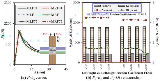 The progressive compressive boundary/loading constraints were defined according to reference points (RP 1-8) using surface-based coupling constraints to ensure force transfer between frame components while maintaining realistic modular behavior. The LCs were not fully restrained but had only restricted translational movement, while all columns and beams were allowed in-plane translation and rotation, thus replicating modular frame flexibility. A three-step progressive loading protocol was applied: (i) Step 1 (Static General)—Pretension bolt loading, which was fixed at its initial length in later stages; (ii) Step 2 (Static General)—Left-column compressive loading until failure (30 mm shortening), while the right column remained free, simulating sequential column failure; (iii) Step 3 (Static Riks)—Right-column loading until failure, with the neighboring failed left column kept free, capturing progressive instability and load redistribution. UCs/LCs and FBs/CBs were welded to the M2M connections, which were represented using a “tie constraint”. The M2M connection components were modeled through surface-to-surface contact interactions, with hard contact defined in the normal direction to prevent interpenetration and finite sliding in the tangential direction, incorporating a friction coefficient of 0.3 based on friction sensitivity analysis. The analysis used μ = 0.1, 0.3, and 0.5 (MLF/RF74, test, and 75, respectively) to evaluate their impact on Pu, Ke, Δu, and DI for both left- and right-column loading, as shown in Figure 11a,b. Reducing friction from 0.3 to 0.1 slightly increased Pu (0.28% left, 0.06% right) and Δu but decreased DI, which suggests that lower friction weakened post-failure ductility. Increasing the friction from 0.3 to 0.5 decreased Pu (−0.23% left, −0.04% right) and Ke (−0.81% left, −1.38% right), while Δu and DI increased, which indicates that excessive friction overestimated ductility but compromised strength and stiffness. Based on these findings, μ = 0.3 was chosen, as it provided the best balance between load-bearing capacity, stiffness, and realistic deformation behavior, ensuring an accurate representation of progressive compressive failure in modular frames. Because the specimens were hot-rolled steel sections, residual stresses and temperature effects were not considered as in Ref. [63].