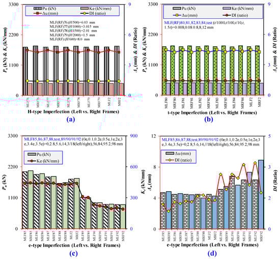 Imperfection outcomes for frames under progressive compression loading: (a) H-type local imperfection effect on ultimate strength/initial stiffness vs. ultimate displacement/ductility index; (b) t-type local imperfection effect on ultimate strength/initial stiffness vs. ultimate displacement/ductility index; (c) e-type global imperfection effect on ultimate strength vs. initial stiffness; (d) e-type global imperfection effect on ultimate displacement vs. ductility index.