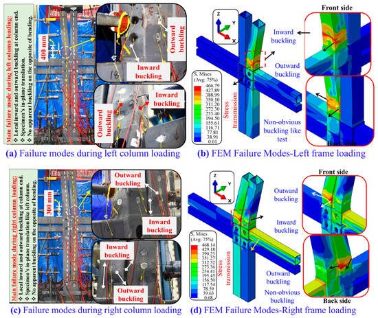 Comparison of test and FEM failure modes under left-/right-column loadings.