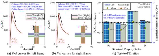 Comparison of test and FEM mechanical behavior under left-/right-column loadings: (a) Load–shortening curves comparison for test and FEM under left column loading; (b) Load–shortening curves comparison for test and FEM under right column loading; (c) Mean and coefficient of variation of test-to-FEM ratios under left and right column loading for ultimate strength, initial stiffness, ultimate displacement, and ductility index.