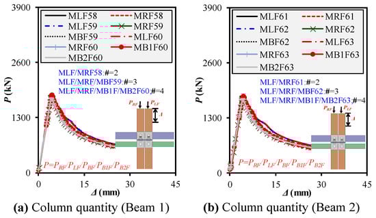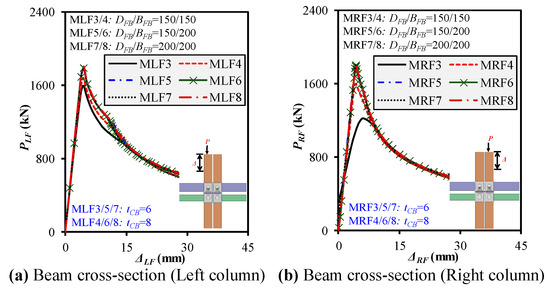 The progressive compressive response of modular steel interior frames was evaluated under varying floor and ceiling beam cross-sectional dimensions (D × B × t)FB/CB while keeping all other structural parameters consistent with the validated FEM configuration, as shown in Figure 15a,b. Cross-sectional variations were introduced across specimens MLF3–MLF8 (for left-column loading) and MRF3–MRF8 (for right-column loading), with FB sizes ranging from 150 × 150 × 8 mm to 200 × 200 × 8 mm and CB sizes from 150 × 150 × 6 mm to 150 × 150 × 8 mm. The findings reveal that increasing the FB cross section from 150 × 150 × 8 mm to 200 × 200 × 8 mm improved the Pu of the MLF specimens by up to 7.6%, with corresponding Ke increases of about 4.5%. The Δu remained relatively stable, around 4.48 mm, while DI showed a marginal decline of approximately 2%. Similar improvements in Pu and Ke were observed in the MRF series, where Pu rose from 1597.97 kN in MRF3 to 1802.06 kN in MRF8—an increase of about 12.8%—with stiffness gains of 8%, despite minor reductions in Δu (2%) and DI (9.3%). The rise in the cross section clearly enhanced frame stability by delaying buckling and minimizing sway, contributing to higher strength and reduced post-ultimate deformation. Interestingly, the variation in CB thickness (from 6 to 8 mm) had a limited impact on the load-bearing performance compared to changes in FB size, which indicates that the floor beams, being the primary load-transferring elements, play a more significant role in resisting progressive compressive loads. The difference in behavior between the left- and right-column loading scenarios also highlights the influence of progressive stress redistribution and residual deformation from prior loading, especially in MRF4, where a notable drop in Pu (23.4%) and rise in DI (6.1%) suggest instability induced by prior failure in the adjacent column.