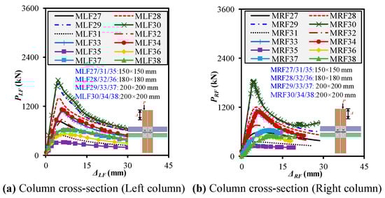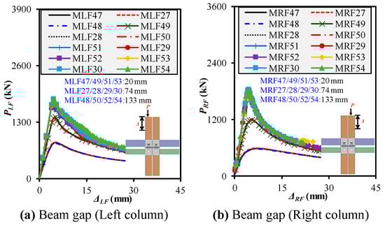 The floor-to-ceiling beam gap influences modular frame systems’ overall load transfer and buckling resistance under progressive compression, as Figure 20a,b shows. All column and beam lengths were held constant at 1266 mm and 1196 mm, respectively, while the inter-beam gap was varied across three levels—20, 74, and 133 mm—for four different column cross-sections—150 × 150, 180 × 180, 200 × 200, and 210 × 210 mm—each with 8 mm thickness. This setup enabled the evaluation of how varying the vertical spacing between beams affects the structural integrity and failure mechanisms under both left- and right-column loading sequences. For the 150 × 150 × 8 mm column series (MLF/RF 47, 27, and 48), as the gap increased from 20 mm (MLF47) to 74 mm (MLF27) and 133 mm (MLF48), there was a mild decrease in Pu from 836.9 to 804.3 kN (↓ ~4%) and in Ke from 223.3 to 224.4 kN/mm, with a slight increase in ductility (Δu and DI). Right-frame counterparts showed a similar trend—Pu dropped from 587.8 to 576.7 kN, while DI remained consistently high (≈2.1–2.6), which indicates increased sway and plasticity with larger gaps. For the 180 × 180 × 8 mm column series (MLF/RF 49, 28, and 50), the left-frame strength remained relatively stable, with Pu values ranging between 1410 and 1380 kN, while DI decreased slightly with the increased gap. Pu declined from 1195 to 1180 kN for the right frames, and Ke followed a similar trend. However, ductility measures showed a more prominent response, with DI peaking for the intermediate gap (74 mm), which indicates a potential transition point in the sway–buckling mechanism. For the 200 × 200 × 8 mm column series (MLF/RF 51, 29, and 52), this group exhibited a minor variation in Pu and Ke across the gap changes (within 1–2%), which suggests that the beam gap has a limited impact on strength when column cross-sectional size is relatively large. The DI for left frames stayed within 1.43–1.44, while right frames displayed slightly reduced ductility with larger gaps, likely due to increased localized deformations from reduced beam confinement. For the 210 × 210 × 8 mm column series (MLF/RF 53, 30, and 54), in this largest column group, the influence of the gap was negligible on load-bearing capacity (Pu ~1814–1831 kN) and Ke (≈445 kN/mm). DI and Δu values remained consistent across all three gaps for both left and right frames, which emphasizes that once column and beam cross-sections are sufficiently stiff, the inter-beam spacing has little influence on progressive failure patterns.