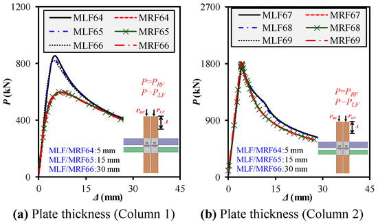 To evaluate the influence of column slenderness on progressive compression performance, four sets of columns—150 × 150 (MF39/27/40), 180 × 180 (MF41/28/42), 200 × 200 (MF43/29/44), and 210 × 210 (MF45/30/46) mm—were analyzed, each with three thicknesses—6, 8, and 10 mm—as presented in Figure 19a,b. Beam and column lengths were fixed at 1196 mm and 1266 mm, respectively. This allowed the isolation of wall thickness as a variable to focus on its effect on strength, stiffness, and ductility under sequential column failure. For 150 × 150 mm cross-section series (MLF/RF 39, 27, and 40), increasing the thickness from 6 mm to 10 mm improved strength and stiffness. For the left frame (MLF), Pu rose from 705 to 927 kN (+31%) and Ke from 150 to 334 kN/mm (+122%). For the right frame (MRF), Pu increased from 488 to 656 kN, while Ke improved from 117 to 245 kN/mm. DI showed contrasting trends: left frames experienced a decrease in DI from ~1.19 to 0.29, which indicates increased brittleness with thicker walls, while right frames showed DI fluctuations due to accumulated damage effects and second-order instability, with a peak DI of 2.6 at 8 mm thickness. For the 180 × 180 mm cross-section series (MLF/RF 41, 28, and 42), with larger cross sections, thickness increases had a more pronounced impact on strength. Pu in left frames rose from 882 to 1642 kN and Ke from 252 to 369 kN/mm. Right frames (MRF41 to MRF42) showed a similar strength gain from 864 to 1299 kN, and Ke improved from 237 to 342 kN/mm. Interestingly, ductility (DI) improved modestly for left frames (1.00 → 1.11) but remained high and stable for right frames (DI ~1.02–2.11), which suggests that increasing the thickness helped stabilize the post-yield response without compromising plastic deformation. For the 200 × 200 mm cross-section series (MLF/RF 43, 29, and 44), in this series, increasing the thickness from 6 to 10 mm yielded modest Pu and Ke improvements but a more significant DI reduction. The MLF Pu rose from 1071 to 1783 kN, while Ke increased from 340 to 499 kN/mm. Pu increased from 864 to 1874 kN for right frames, with a notable Ke jump from 324 to 479 kN/mm. DI declined from ~1.33 to ~1.04, which reflects increasing stiffness-driven brittle failure tendencies in the right columns under secondary instability effects. For the 210 × 210 mm cross-section series (MLF/RF 45, 30, and 46), increased thickness produced the most substantial strength enhancement. Pu for left frames rose from 720 to 2256 kN and Ke from 303 to 538 kN/mm, marking a 213% gain in strength and a 77% increase in stiffness. The right-frame results were consistent: Pu rose from 852 to 2036 kN and Ke from 342 to 542 kN/mm. Unlike for the thinner columns, ductility remained relatively steady across both loading directions (DI ~1.28–1.60), which shows that a higher thickness in large columns offers a better balance between strength and deformation capacity.