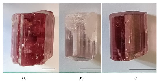 - Suwanmanee, W.; Wanthanachaisaeng, B.; Utapong, T.; Sutthirat, C. Colour Enhancement of Pink Tourmaline from Nigeria by Electron-Beam and Gamma Irradiation. J. Gemmol. 2021, 37, 514–526. [Google Scholar] [CrossRef]