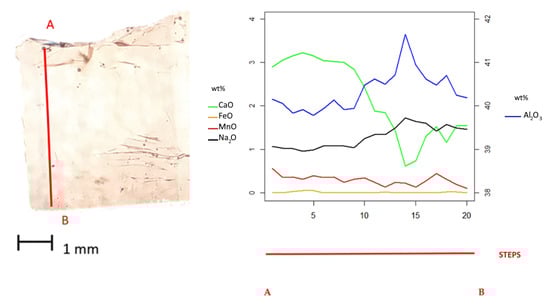 Likewise, the RUSS1 sample exhibits a pink color. The analyses were performed on a section cut parallel to the c-axis (AB in Figure 3). EPMA traverse shows a significant variation in some elements: CaO is present in high amounts in the upper part of the sample (3.15 wt%) and decreases notably toward the lower zone of the sample, reaching a value of 0.62 wt%.