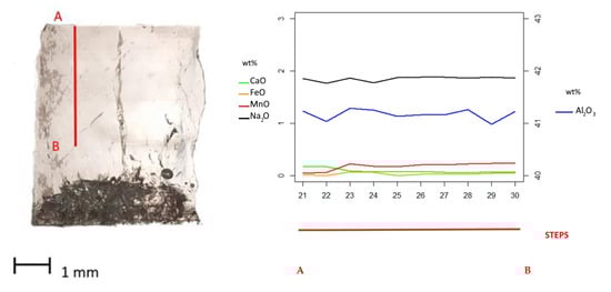 An opposite trend is observed for Al2O3, which is present at approximately 39.70 wt% in the upper part of the sample, increases to 41.65 wt% in the lower part, and then decreases again to 40.18 wt%. The Na2O content increases toward the lower part of the sample, starting at 0.95 wt% and reaching a maximum of 1.71 wt%. Notably, around analysis points 14–15, the Na2O content exceeds that of CaO (1.71–1.64 wt% vs. 0.62–0.73 wt%, respectively). The upper part of the slice shows a discrete amount of MnO (0.56 wt%), which correlates with the observed color. The MnO content decreases slightly in the lower part to 0.10 wt%. The FeO content remains negligible throughout the sample.