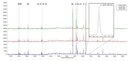 LIBS spectra acquired on the CRUZ1 sample. Comparisons among the spectra acquired on core (blue), intermediate (red), and rim regions (green) are stacked. The main emission lines of H, Li, Na, Al, Si, Ca, and Mn are indicated. The Li emission line at 670.706 nm in the enlarged detail shows different intensities due to different Li₂O content.