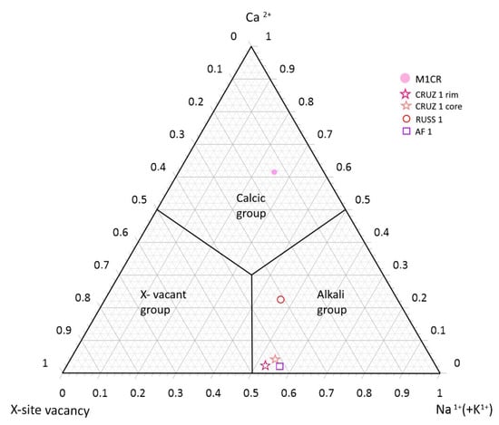This diagram, based on the dominant occupancy of the X site, shows that the samples from Cruzeiro (CRUZ1) mine and Afghanistan (AF1) belong to the alkali group. The RUSS1 sample also belongs to the same group, although it is richer in Ca. In contrast, the pink tourmaline from Anjanabonoina (M1CR) falls under the Calcic group, having XCa > XNa, WF > who, and Y(2Li + Al) dominant. These chemical features correspond to Mn-bearing fluor-liddicoatite Ca(Li2Al)Al6(Si6O18)(BO3)3(OH)3F [].