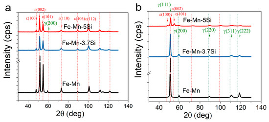 X-ray diffractions of the Fe-Mn alloys after HPT at 20 °C (a) and after HPT at 300 °C (b).