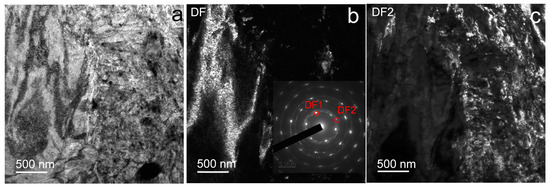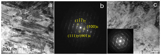 In this case, TEM images of the Fe-Mn alloy structure after HPT at a temperature of 20 °C reveal a non-uniform predominantly martensitic structure of the alloy (Figure 4). In this structure, along with areas of fine-grained structure (Figure 4c) with large lattice distortions, coarser-grained areas are found (Figure 4b). Finer-grained areas are represented by an ultrafine-grained structure with an average size of structural elements of 103 ± 6 nm, and in areas with a larger structure, the formation of shear bands 150–1000 nm thick is revealed.