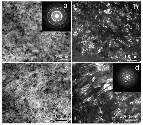 The structure of the Fe-Mn-5Si alloy after the same treatment is very inhomogeneous (Figure 6). Thus, Figure 6a,c show two types of structure with different misorientation of grains or subgrains. Figure 6a shows an ultrafine-grained grain-subgrain structure that is confirmed, among other things, by the diffraction pattern in the inset. The structure in Figure 6 is coarser-grained with less distortion. In areas with an ultrafine-grained structure, the average size of structural elements is 52 ± 6 nm (Figure 6a,b). At the same time, areas with a larger structure are represented by structural elements with an average size of 181 ± 11 nm (Figure 6c,d).