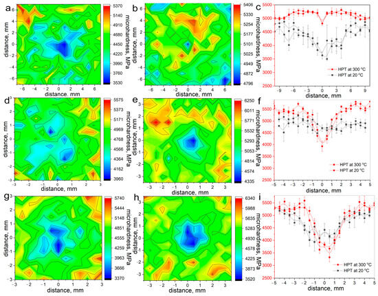 Microhardness of Fe-Mn alloys produced by HPT: (a–c) Fe-Mn alloy; (d–f) Fe-Mn-3.7Si alloy; (g–i) Fe-Mn-3.7Si alloy; (a,d,g) after HPT at 20 °C; (b,e,h) after HPT at 300 °C; (a,b,d,e,g,h) distribution over surface of an HPT sample; (c,f,i) distribution along the diameters.