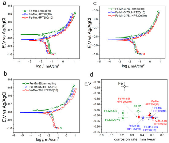The corrosion properties of Fe-Mn alloys were assessed using electrochemical measurements by the potentiodynamic polarization (PDP) method. The PDP curves (Figure 9a–c) obtained after 20 min of open-circuit holding were almost identical, indicating that a stable potential had been achieved. Since alloys in different structural-phase states were obtained and investigated during this study, a detailed analysis made it possible to estimate the effect of these states on the corrosion rate.