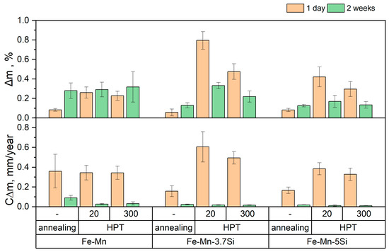 Figure 10 clearly shows a significant decrease in the degradation rate of Si alloys in the initial state relative to the Fe-Mn alloy. This effect is explained by the presence of annealing twins in the structure of silicon alloys. At the same time, a large measurement error in the mass loss ∆m of the Fe-Mn alloy may indicate sufficiently deep pitting damage, which complicates the removal of corrosion products from the surface of the sample. The measurement error is also introduced by the heterogeneity of the alloy structure after HPT, especially in the martensitic state. Some discrepancy in the corrosion rates determined by the two methods presented above can be explained by different testing media and conditions.