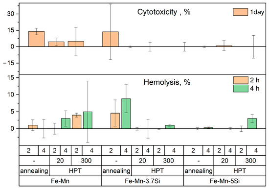 - The study of cytotoxicity and induced hemolysis in vitro showed that Fe-Mn, Fe-Mn-3.7Si, and Fe–Mn-5Si alloys after HPT can be characterized as biocompatible, and also allowed to suggest an increase in the tolerance of blood cells to the products of bioresorption of alloys containing Si.