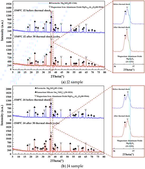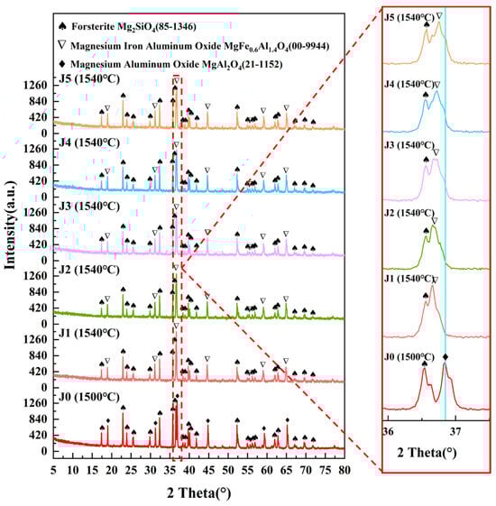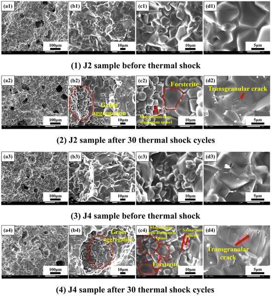 - Wu, S.; Hou, Q.; Yu, J.; Wang, C.; Zhao, J.-L.; Wang, S.; Luo, X.; Qi, X. Sintering behavior and thermal shock resistance of MgO-Mg2SiO4 refractories by co-doped silica fume and quicklime. Ceram. Int. 2024, 50, 56060–56069. [Google Scholar] [CrossRef]