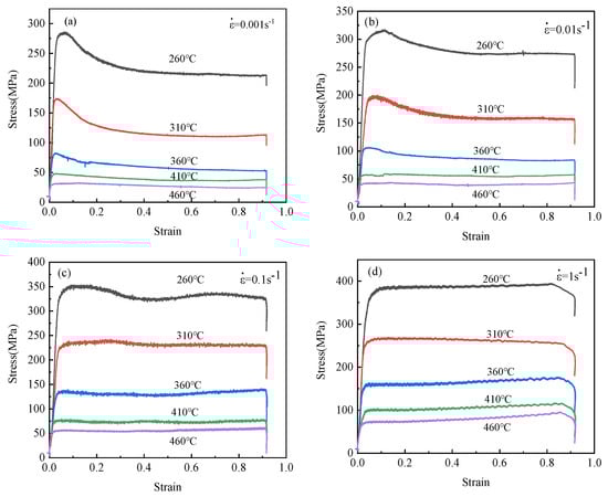 True stress–strain curves of 2A97 Al-Li alloy treated by thermal compression at different strain rates. (a) 0.001 s−1, (b) 0.01 s−1, (c) 0.1 s−1, (d) 1 s−1.