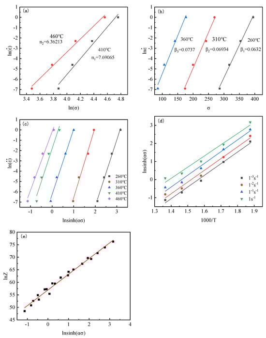 where A2 and β are material constants, and the parameters satisfy the α = β/n1 functional equation. According to the study of Zener and Hollomon [], the strain rate of metal during plastic deformation at high temperatures is controlled by the thermal activation process, and the relationship between the strain rate and temperature can be expressed by the Zener–Hollomon parameter (abbreviated as the Z parameter). So, according to Equation (1), the Z parameter can be conveniently expressed in terms of a temperature-compensated strain rate.