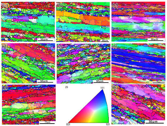 EBSD IPF map of 2A97 alloy under different deformation conditions. (a) 260 °C × 0.001 s−1, (b) 310 °C × 0.001 s−1, (c) 360 °C × 0.001 s−1, (d) 410 °C × 0.001 s−1, (e) 460 °C × 0.001 s−1, (f) 410 °C × 0.01 s−1, (g) 460 °C × 0.01 s−1, (h) 410 °C × 1 s−1.