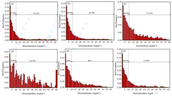 Misorientation of 2A97 alloy samples under different hot deformation conditions. (a) 310 °C × 0.001 s−1, (b) 360 °C × 0.001 s−1, (c) 410 °C × 0.001 s−1, (d) 460 °C × 0.001 s−1, (e) 410 °C × 0.01 s−1, (f) 410 °C × 1 s−1.