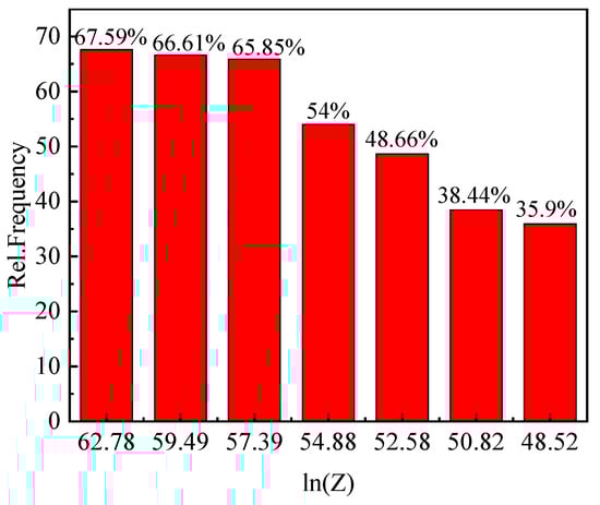 Based on the above results, the microstructural evolution of the alloy during thermal deformation is directly influenced by either temperature or the strain rate when the other parameter is held constant. However, to fully understand the microstructural evolution of the alloy, it is necessary to consider the combined effects of strain rate and temperature. According to Equations (9) and (11), the calculated Z parameter can be used to analyze the combined influence of strain rate and temperature on microstructural evolution during the thermal deformation process, thereby revealing the thermal deformation behavior of the 2A97 Al-Li alloy. The strong correlation between the lnZ value and the DRX process of the 2A97 Al-Li alloy has been extensively studied []. Regarding the formation of recrystallized grains, DRX processes are generally categorized into three types: discontinuous dynamic recrystallization (abbreviated as DDRX), continuous dynamic recrystallization (abbreviated as CDRX), and grain boundary migration-driven dynamic recrystallization (abbreviated as GDRX). Figure 5 illustrates the variation in the volume fraction of LAGBs for different lnZ values. The corresponding lnZ values under different thermal deformation conditions are provided in Table 1.