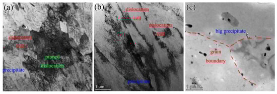 As shown in Figure 6, several dislocations are either pinned by fine secondary phases or become entangled with each other, leading to the formation of dislocation clusters. These regions of agglomerated dislocations undergo DRV and subsequently experience polygonization, resulting in the formation of dislocation cells and sub-grains. As the lnZ value decreases, the dislocation density is reduced, indicating a more ordered dislocation arrangement due to the weakening of precipitate-induced pinning and the enhanced degree of DRV. With further development, dislocation cells and sub-grains gradually evolve into DRX grains characterized by clean and straight HAGBs.