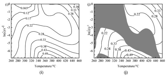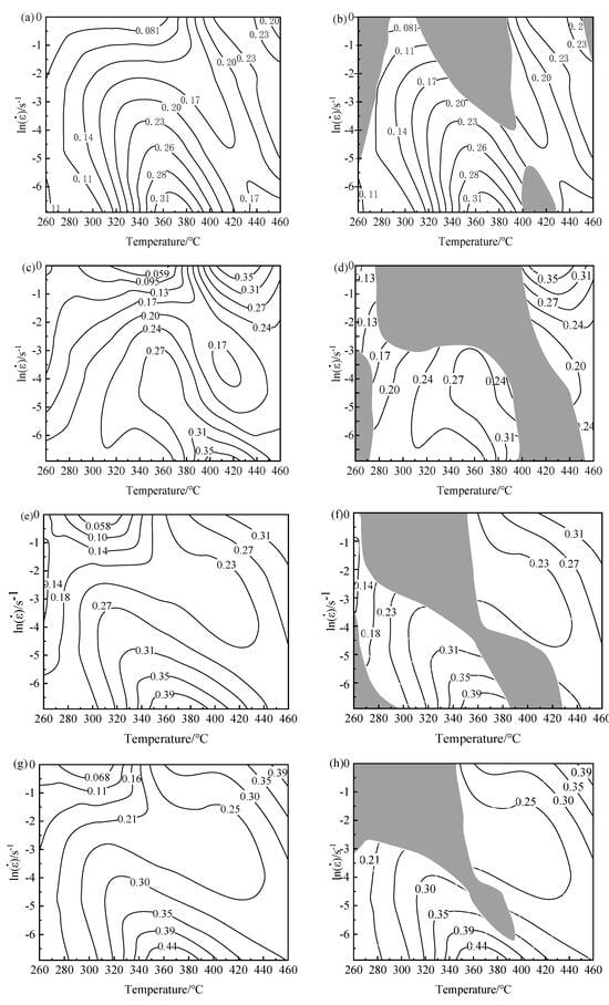 Based on the stress–strain curves and the deformed microstructural features, typical thermal processing maps of 2A97 Al-Li alloy at different strains were established, as shown in Figure 7. These processing maps provide valuable insights into the thermal workability of the 2A97 alloy. In these maps, the contour lines represent power dissipation efficiencies, and the shaded regions indicate the flow destabilization zones.