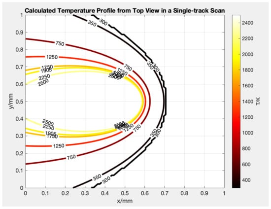 The first step is to establish the thermal profile, which serves as the foundation for the process. The input of the model, which includes the material properties of Ti-6Al-4V, the processing parameters, and the geometry of the part, is detailed and presented in Table 1. The prior work has validated the thermal model [24], texture model [25], and grain size model [26]. The thermal history was validated against the experimental results of the molten pool size under the assumption of steady-state.