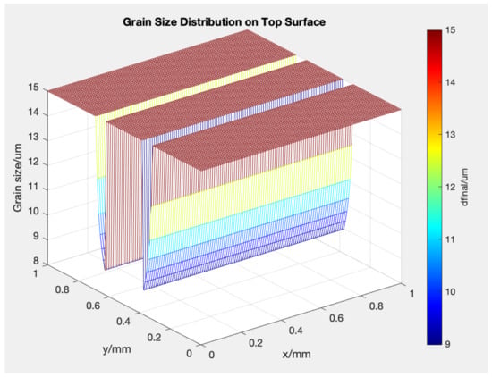 Grain size can be analytically modeled along with the thermal stress obtained and the dynamic growth of the grain recrystallization during heating and grain refinement during cooling, as demonstrated in previous work [26]. The dynamic recrystallization and the resulting grain size are predicted by the JMAK model [34,35,36,37]. This model uses a statistical methodology. J. Cahn developed the theory after that, taking into account continual cooling [38]. In AM, grain refining is more noticeable due to quick cooling. Through experimental verifications and quantitative relations, Umemoto et al. [39] calculated its impact on certain alloys. We can analytically describe grain size in AM using the computed thermal stress, dynamic recrystallization grain growth during heating, and grain refinement during cooling.