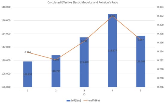 The elastic modulus and Poisson’s ratio have been calculated and are presented in Table 3 and Table 4 and Figure 5. As shown in Table 3 and Table 4 and Figure 5, the values of elastic modulus and Poisson’s ratio indeed vary during processing, so in this sense, it is necessary to update the values for residual stress analytical models.