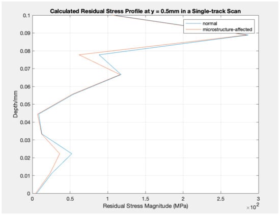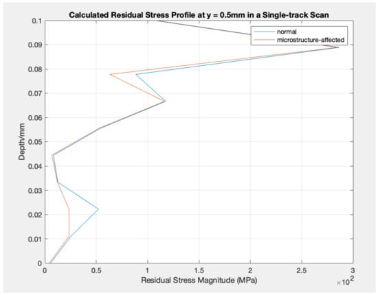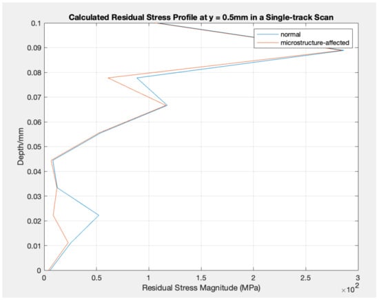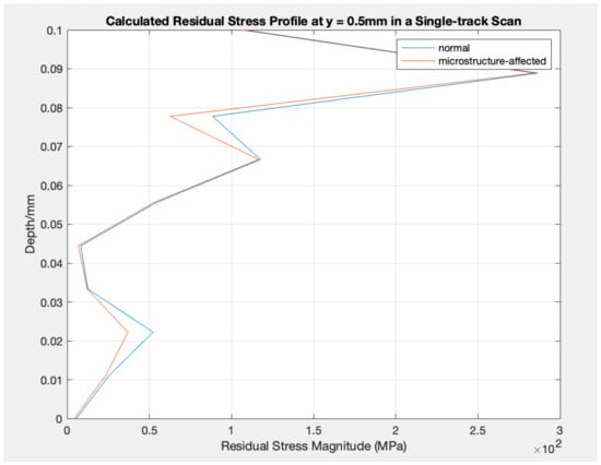 Calculated Residual Stress Profile at y = 0.5 mm in a Single-track Scan: normal vs. microstructure-affected. (ID: 5).