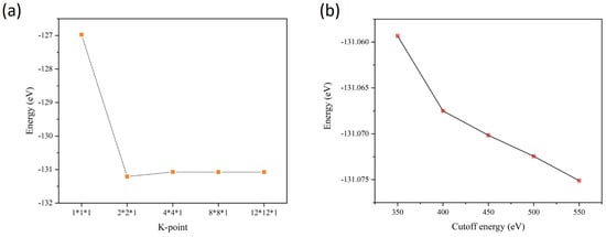 In this study, all computational calculations were performed using density functional theory (DFT) as implemented in the Vienna Ab initio Simulation Package (VASP) [,]. The exchange–correlation interactions were treated using the Perdew-Burke-Ernzerhof (PBE) functional within the framework of the generalized gradient approximation (GGA) [,]. Ion–electron interactions were described through the projector-augmented wave (PAW) method []. To accurately account for van der Waals interactions, we incorporated the DFT-D3 correction method developed by Grimme [,]. A plane-wave cutoff energy of 450 eV was set to fix the basis set size. Convergence criteria were defined as 10−5 eV for energy and 0.05 eV Å−1 for forces. Brillouin zone integration was performed using a 4 × 4 × 1 k-point mesh, and a vacuum layer of 20 Å was implemented along the z-direction to eliminate spurious interactions arising from periodic boundary conditions. To ascertain the quality of the results with respect to the k-point grid and cutoff energy, the variation of the total energy as a function of these criteria is presented in Figure 1a,b for the SGa2Se/TeMoS heterojunction. As can be seen, beyond the 4 × 4 × 1 k-point grid and 450 eV cutoff energy, which are the parameters selected for our study, the energy varies by less than approximately 5 meV. For the precise determination of electronic structures and optical properties, we employed the Heyd-Scuseria-Ernzerhof (HSE06) hybrid functional []. Furthermore, atomic charge distributions were quantitatively analyzed using the Bader charge analysis method [].