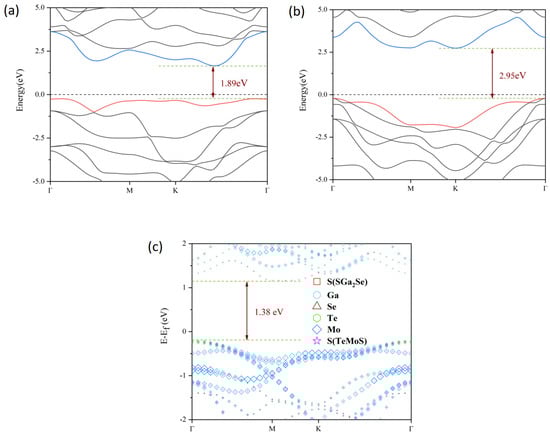 Electronic band structures of (a) the TeMoS monolayer and (b) the SGa2Se monolayer, with the Fermi level set to zero. (c) Projected band structure of the SGa2Se/TeMoS heterojunction.