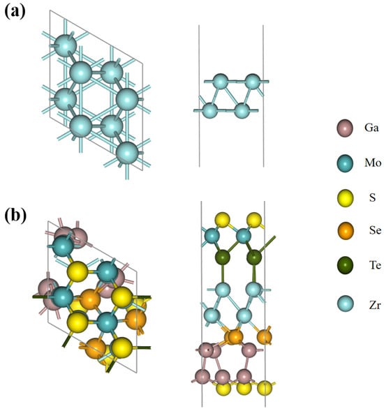 Top and side views of (a) the Zr layer and (b) the SGa2Se/Zr/TeMoS heterojunction.