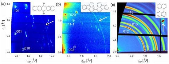 GIXD patterns of (a) pentacenequinone (P2O), (b) diindenoperylene (DIP), and (c) binaphthalene crystals. For clarity, Laue indices are given only for selected Bragg peaks; positions were calculated for the contact planes (102) in P2O (a), (121) in DIP (b), and (217) in BNP (c). The arrows indicate diffraction features of the substrate. The chemical structures of the molecules are given as insets.